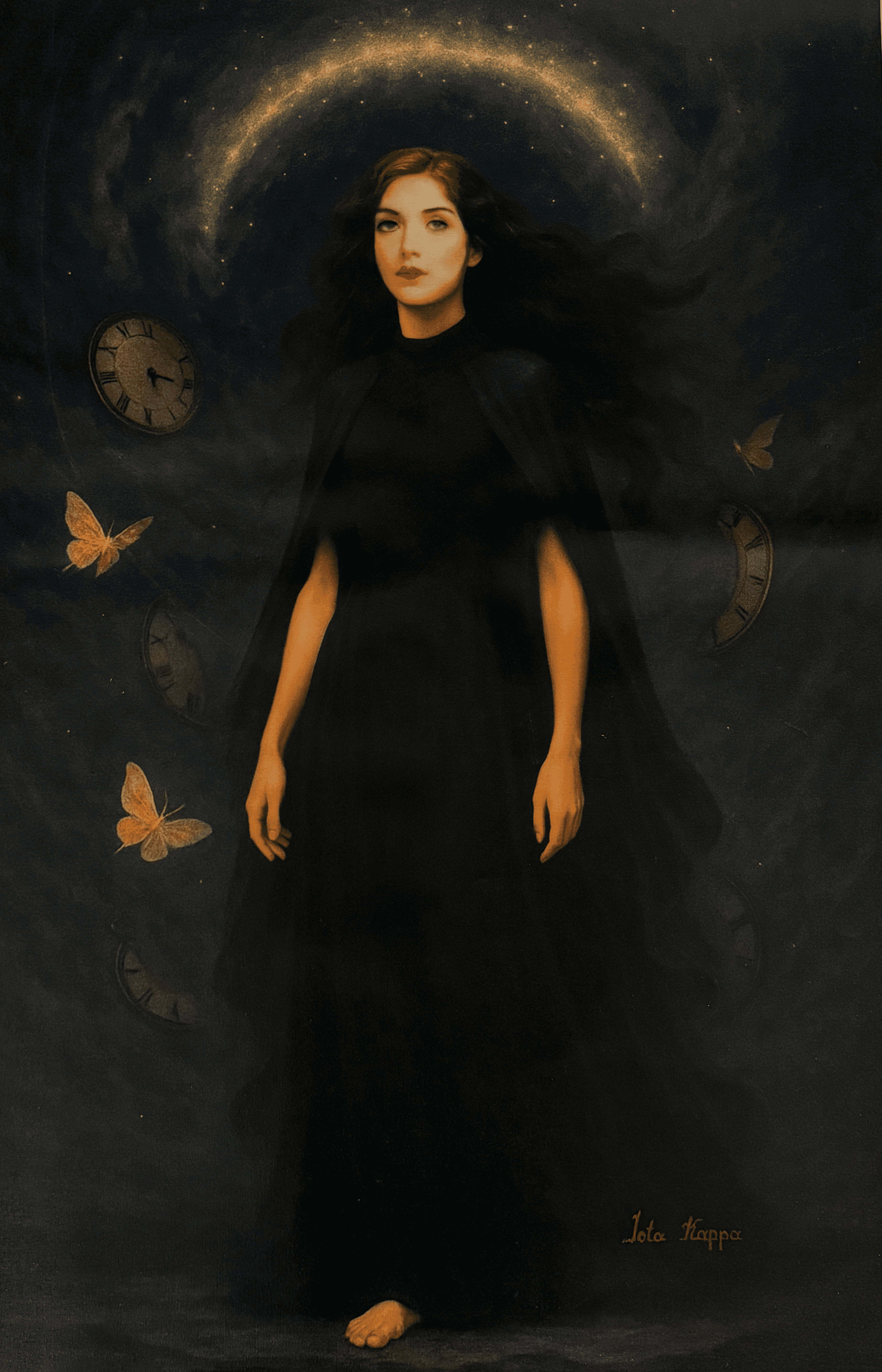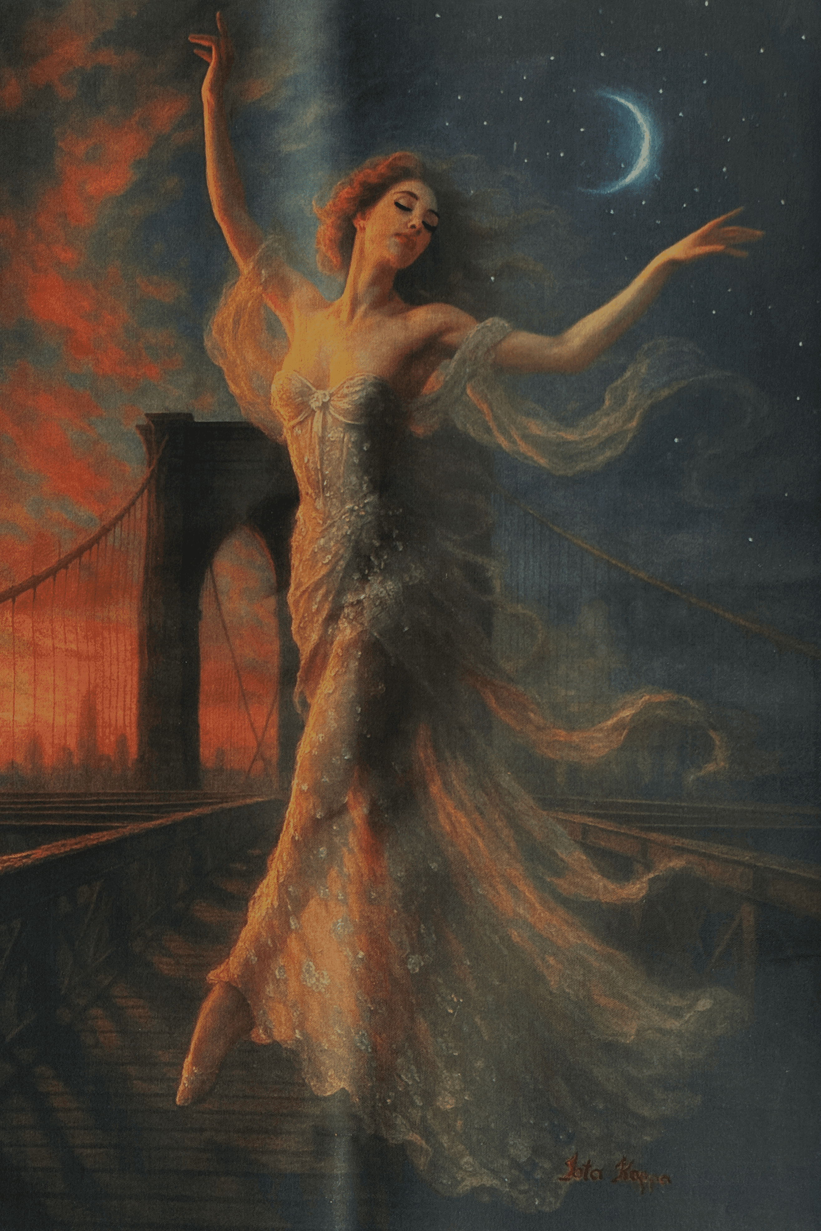 She dances between fire and moonlight, dusk and dawn, spirit and structure. Suspended mid-motion on the bridge between two worlds, she is neither fleeing the darkness nor rushing toward the light—but honoring both. In this work, equilibrium is not portrayed as stillness but as movement: the sacred choreography of contradictions in harmony.
