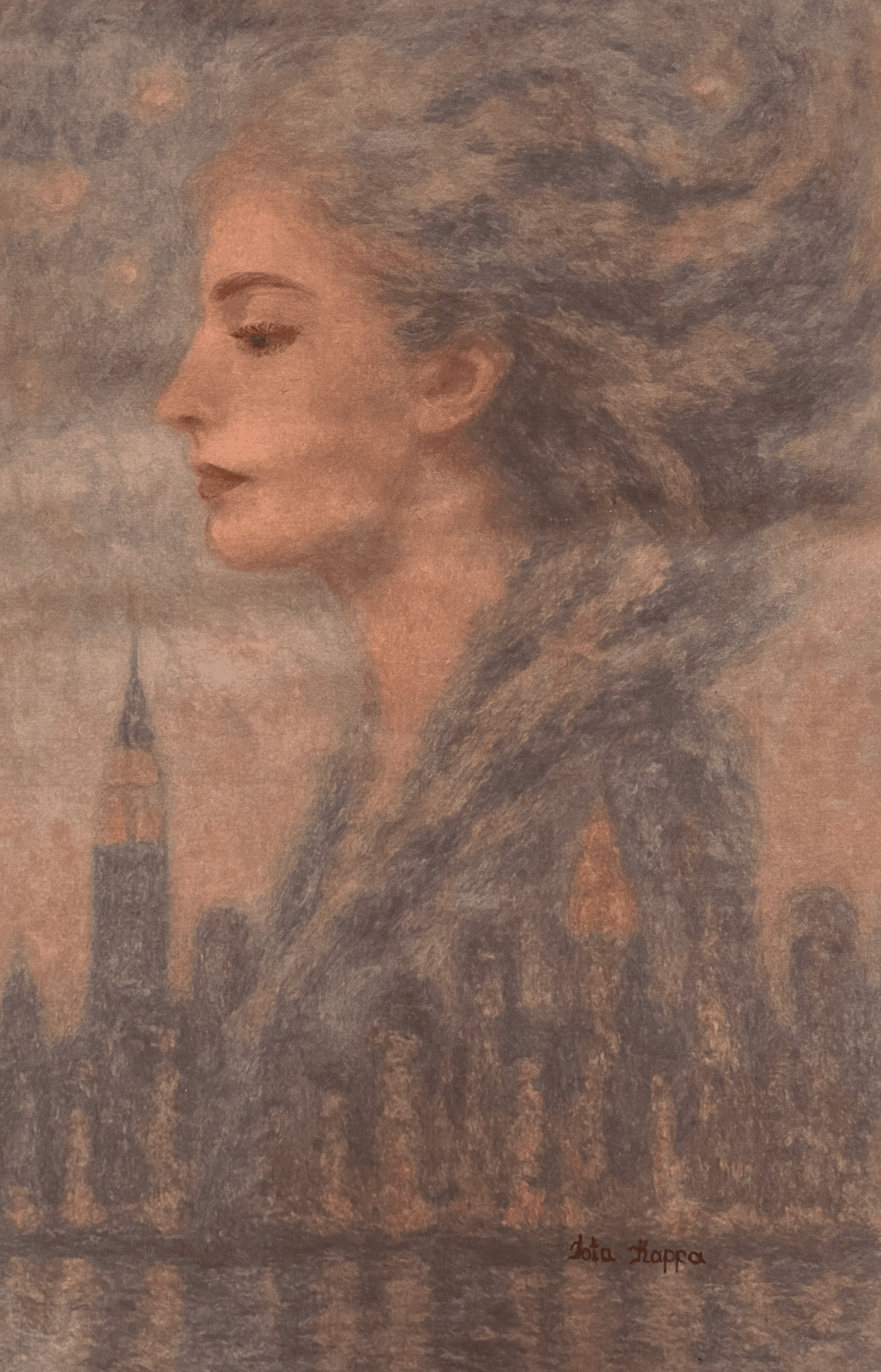 A woman stands poised between skyline and ether, where memory, ambition, and unseen futures converge. Surrounded by the spectral faces of great minds before her, she becomes a vessel for the yet-to-be. This work speaks to the earliest spark of becoming: vision.