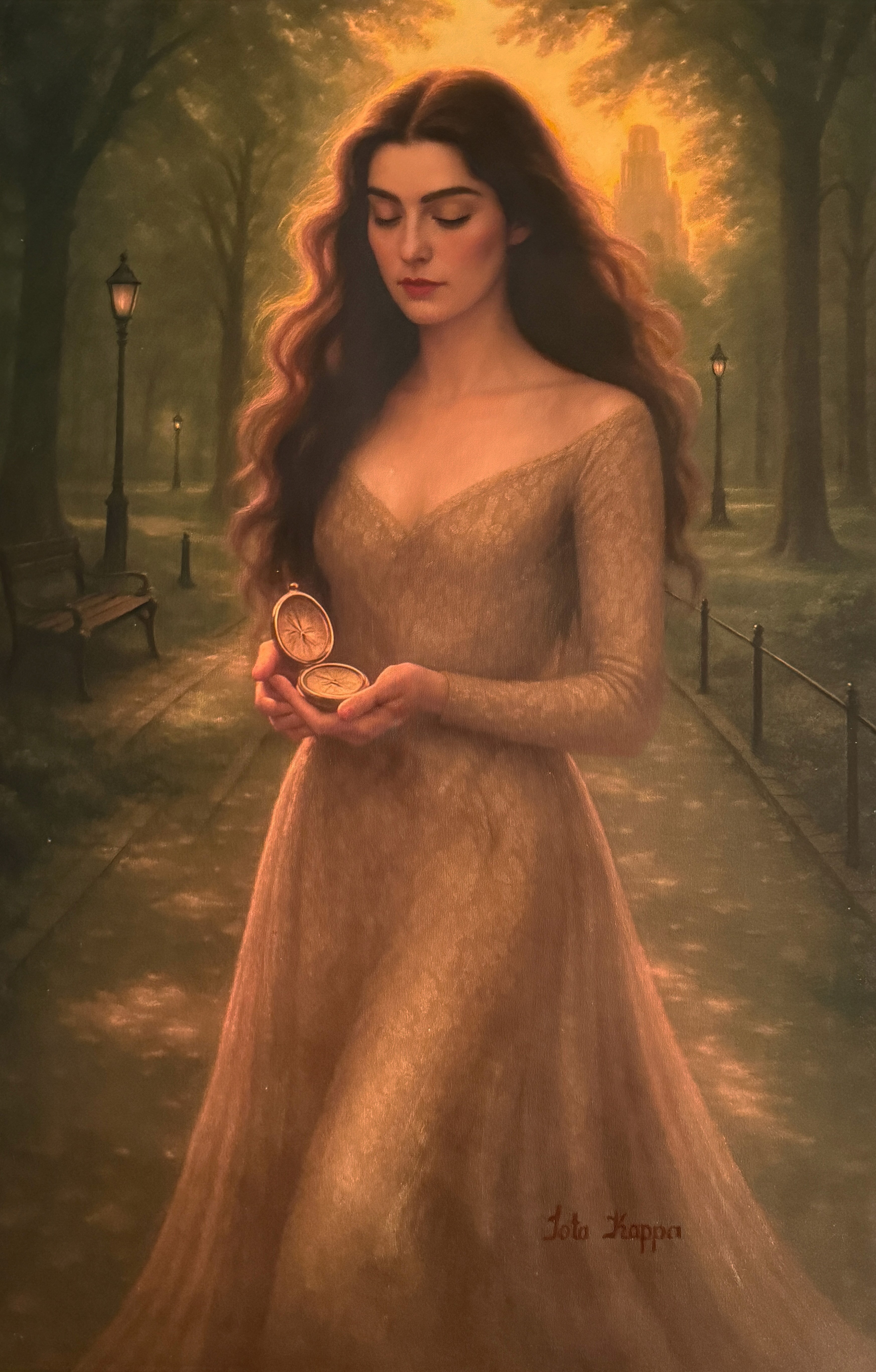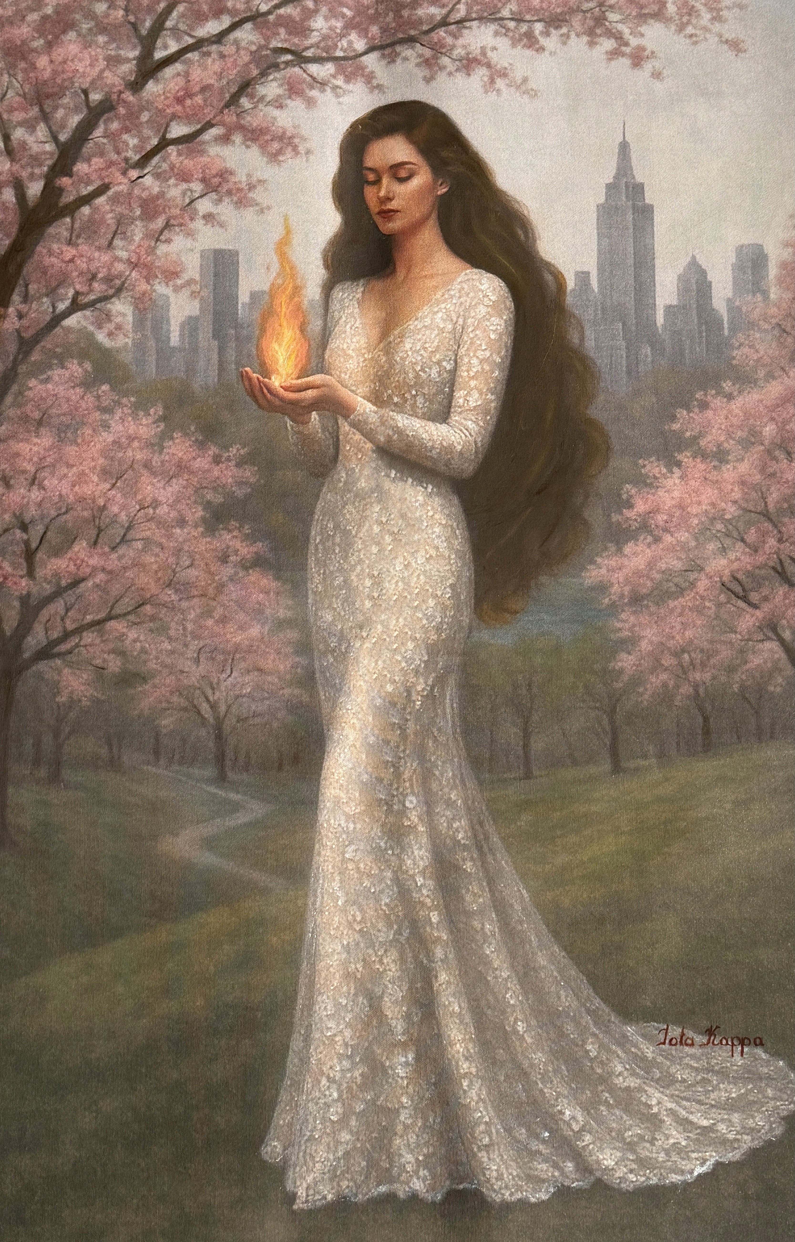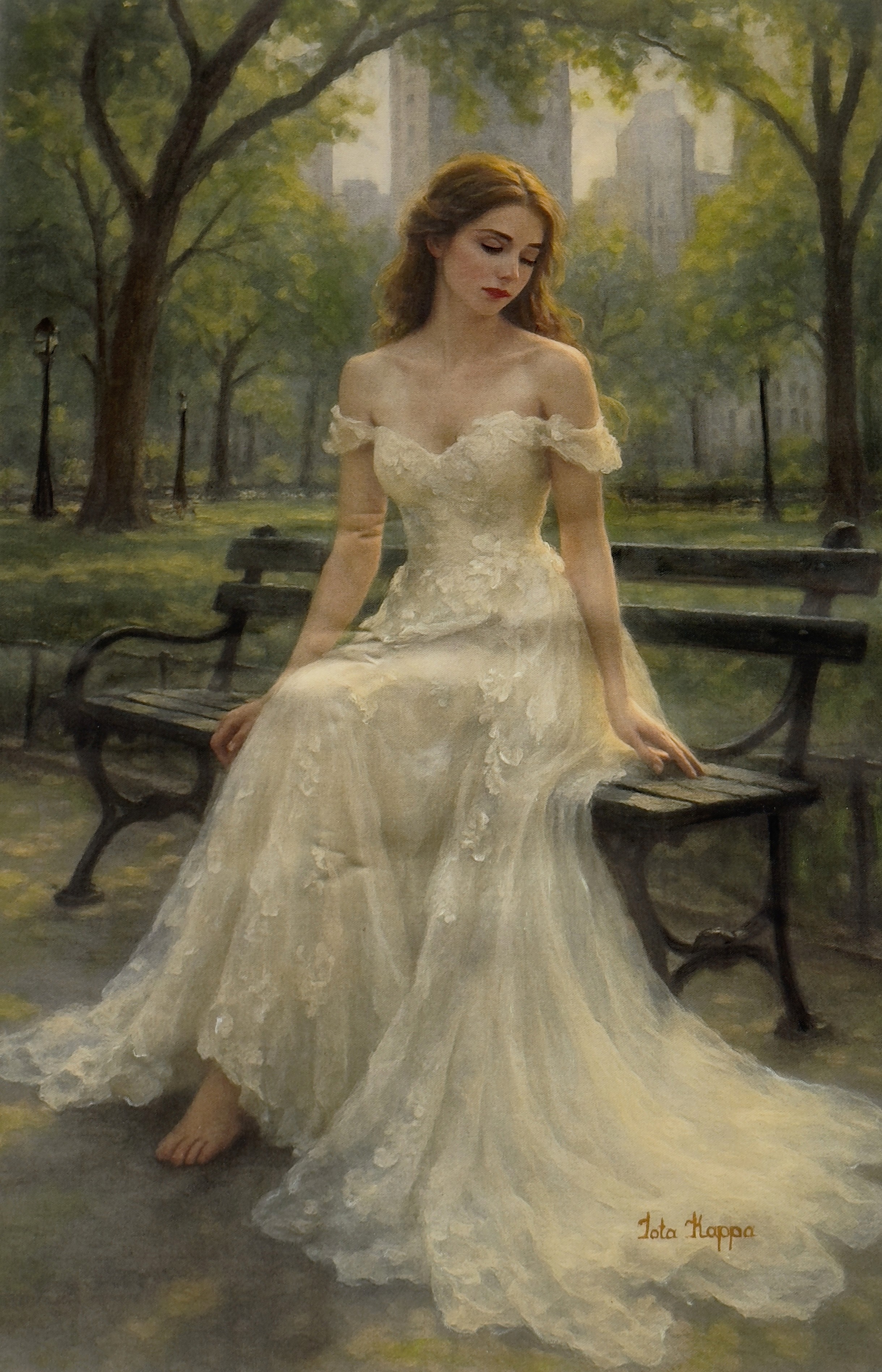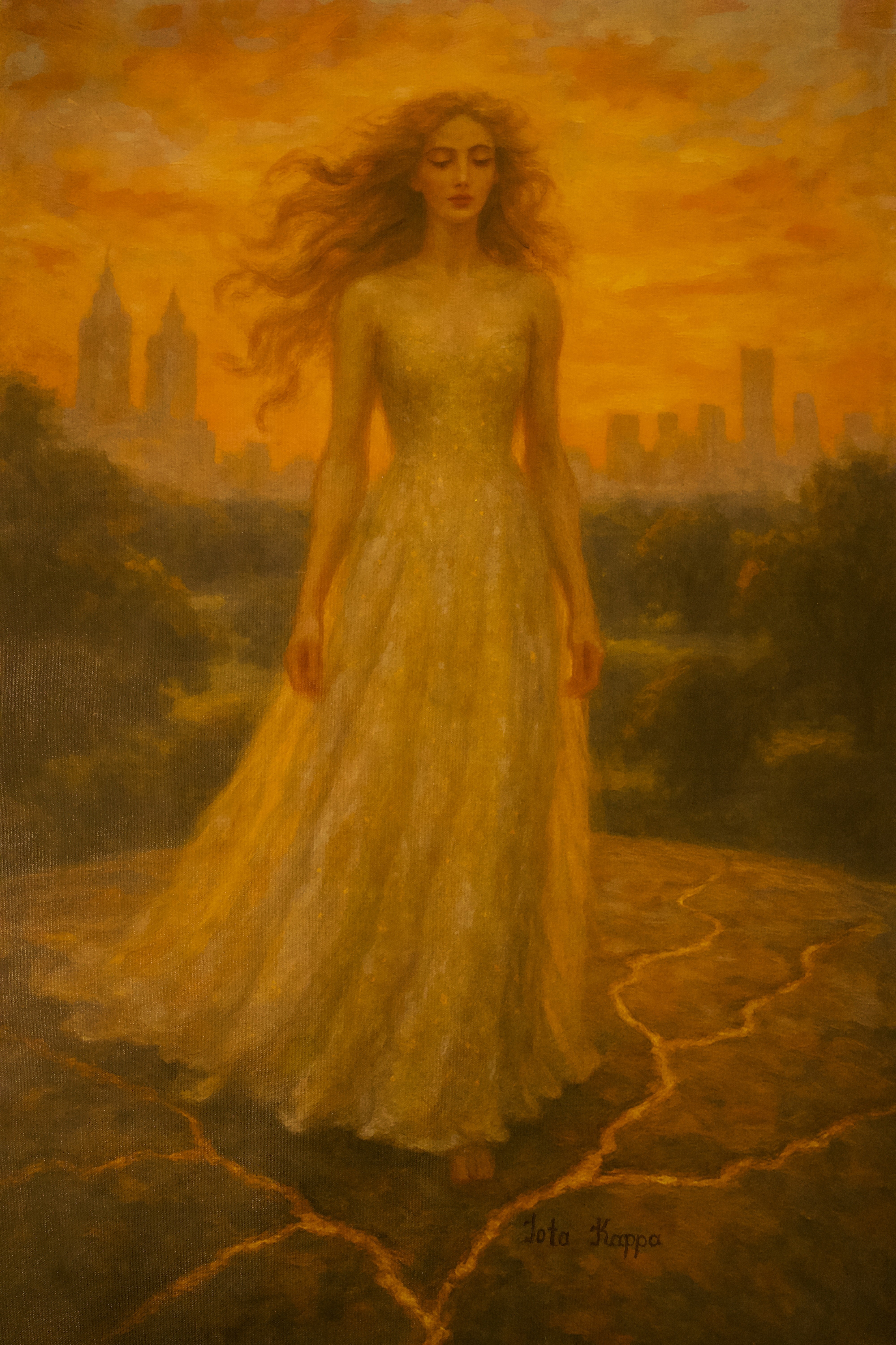 Barefoot on solid ground and draped in a gown of quiet elegance, "The Poise of Thanks” captures a woman in a state of still reflection—embodying humility, presence, and soft strength. Behind her, the city pulses with ambition, but she chooses instead to dwell in appreciation for what is.