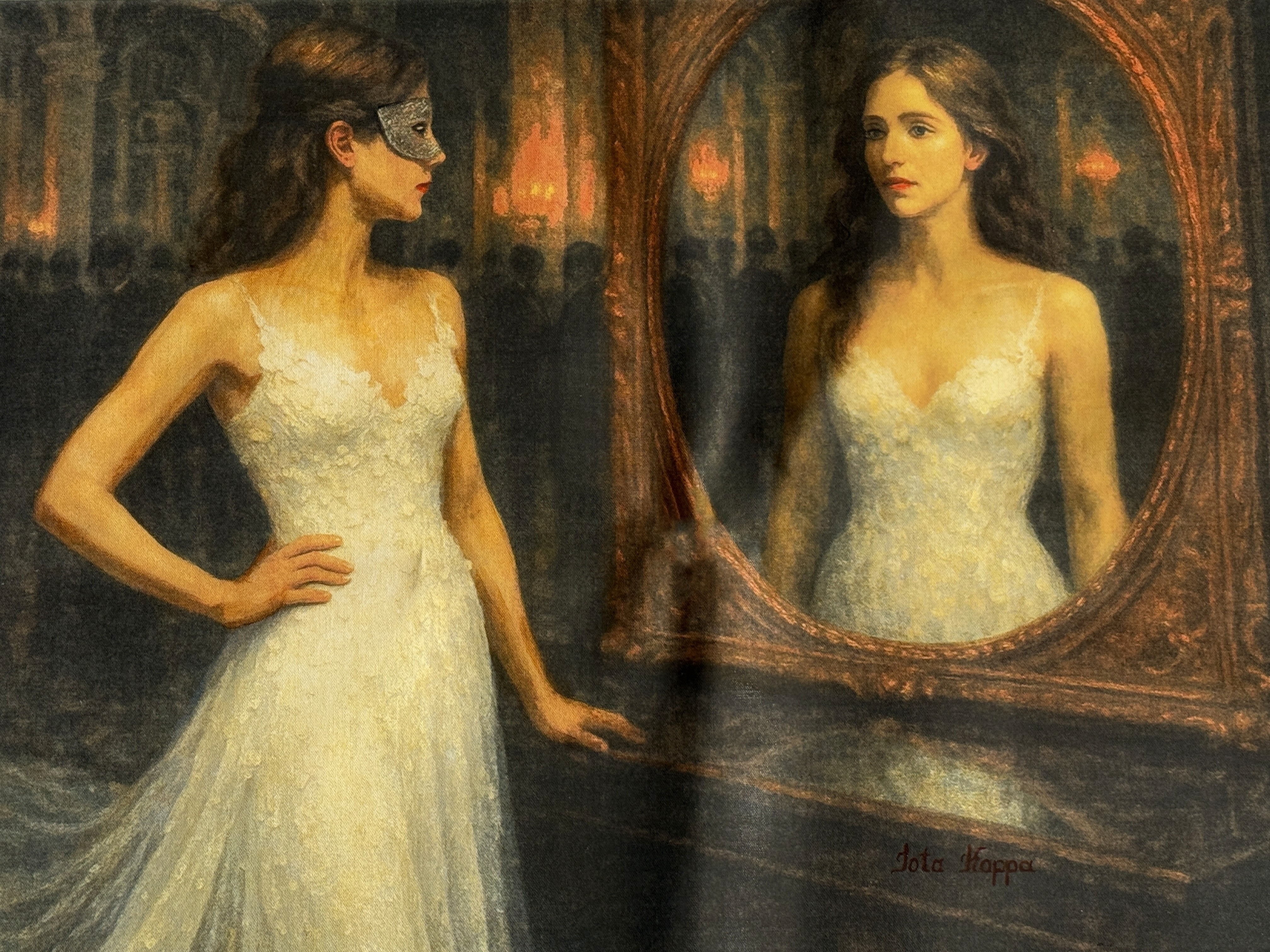 She stands between two worlds: the one she presents and the one she truly inhabits. In the reflection, there is no mask, no performance—only clarity, only self. This work confronts the perennial human tension between persona and presence, illusion and essence. The masked figure stares into the mirror, not to admire or perform, but to remember who she is beneath expectations, beneath applause.