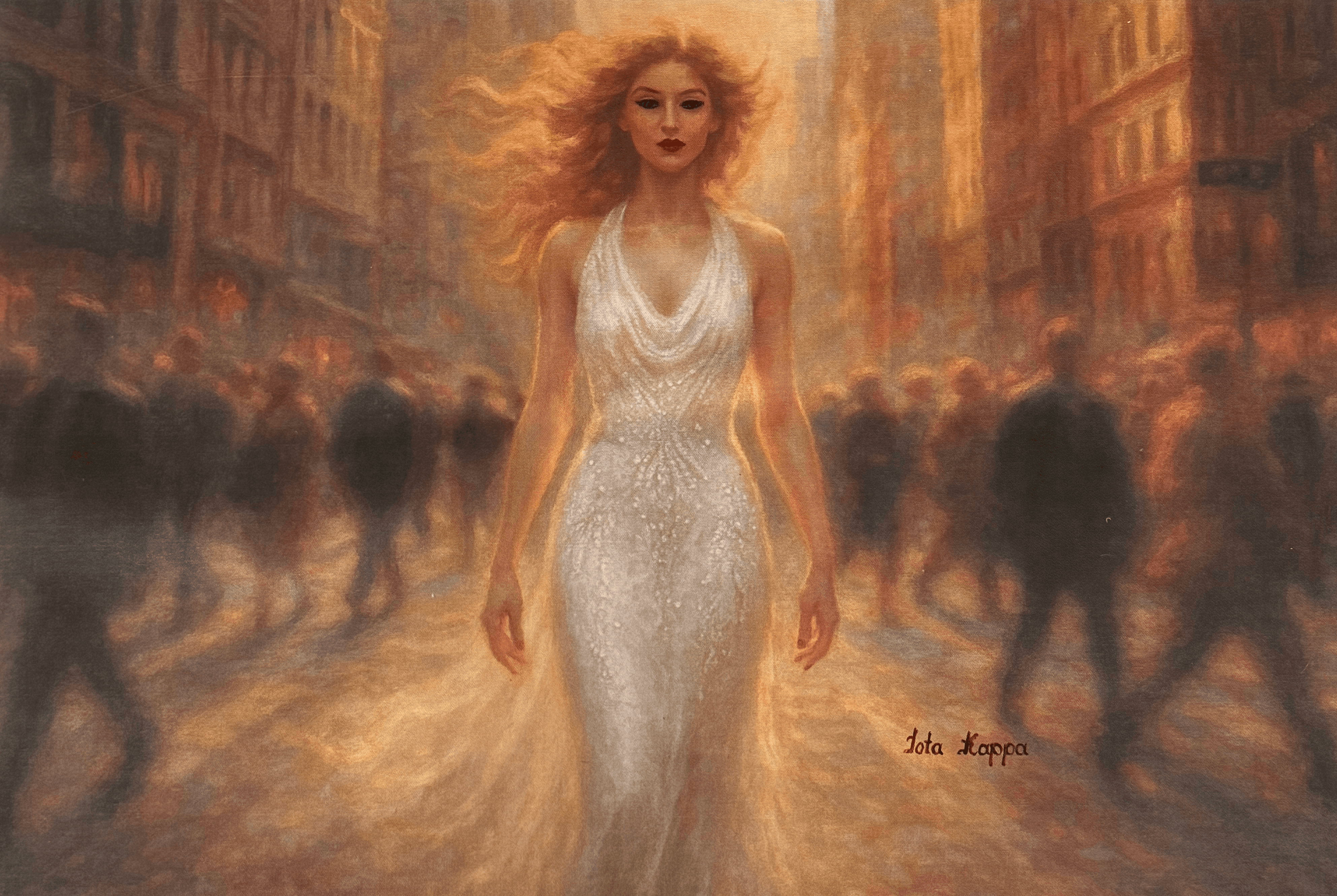 Her presence rewrites tempo. Light follows her, not the other way around. In this golden hour, she does not hurry. She moves with the poise of one who knows she belongs to the future she walks toward. Around her, the city blurs—rushing, unraveling, collapsing into urgency. Yet she remains unmoved by its rhythm. Time does not lead her. She leads it. Her pace is her power. Her gaze, clear and eternal, cuts through the noise.
