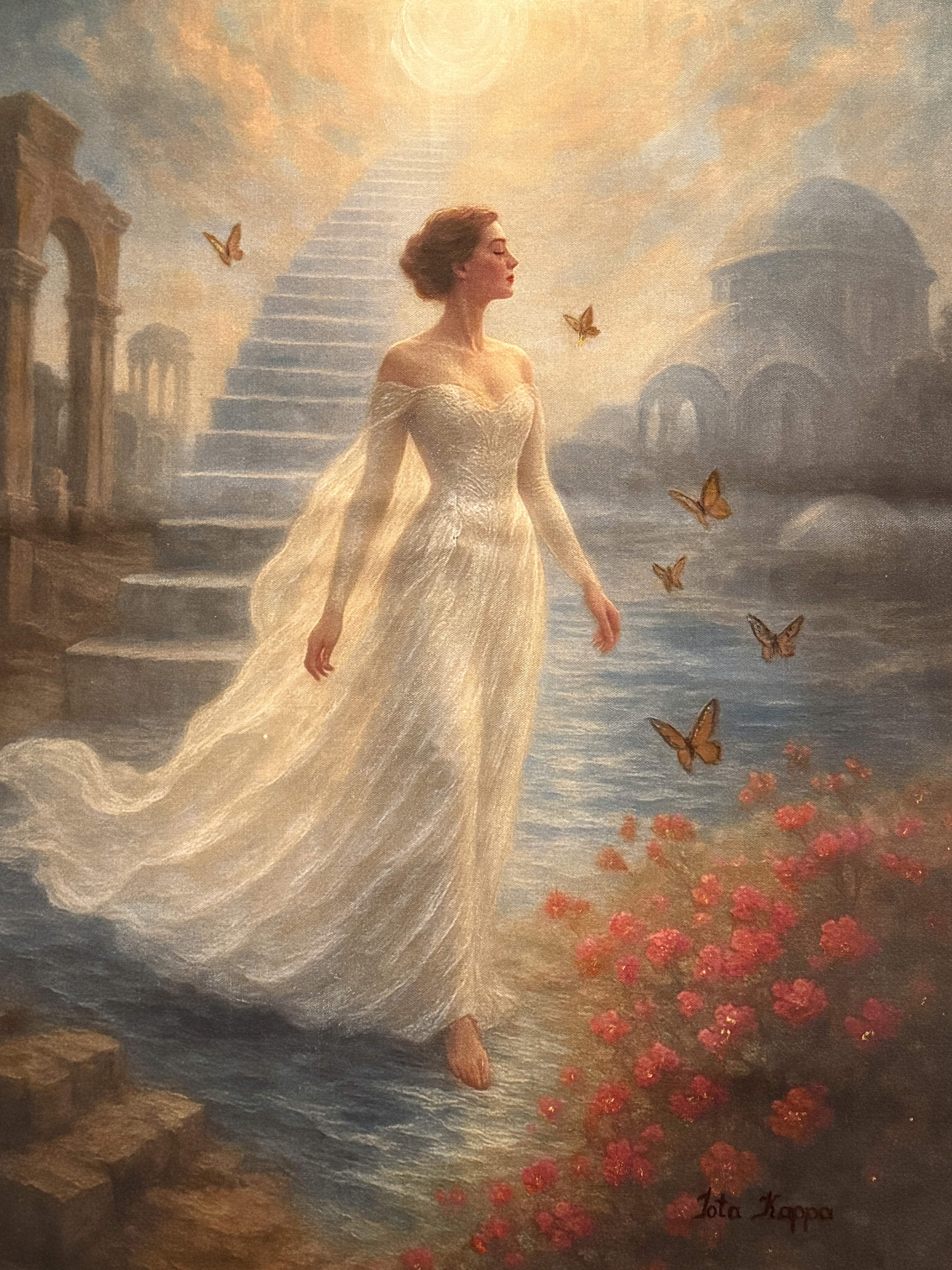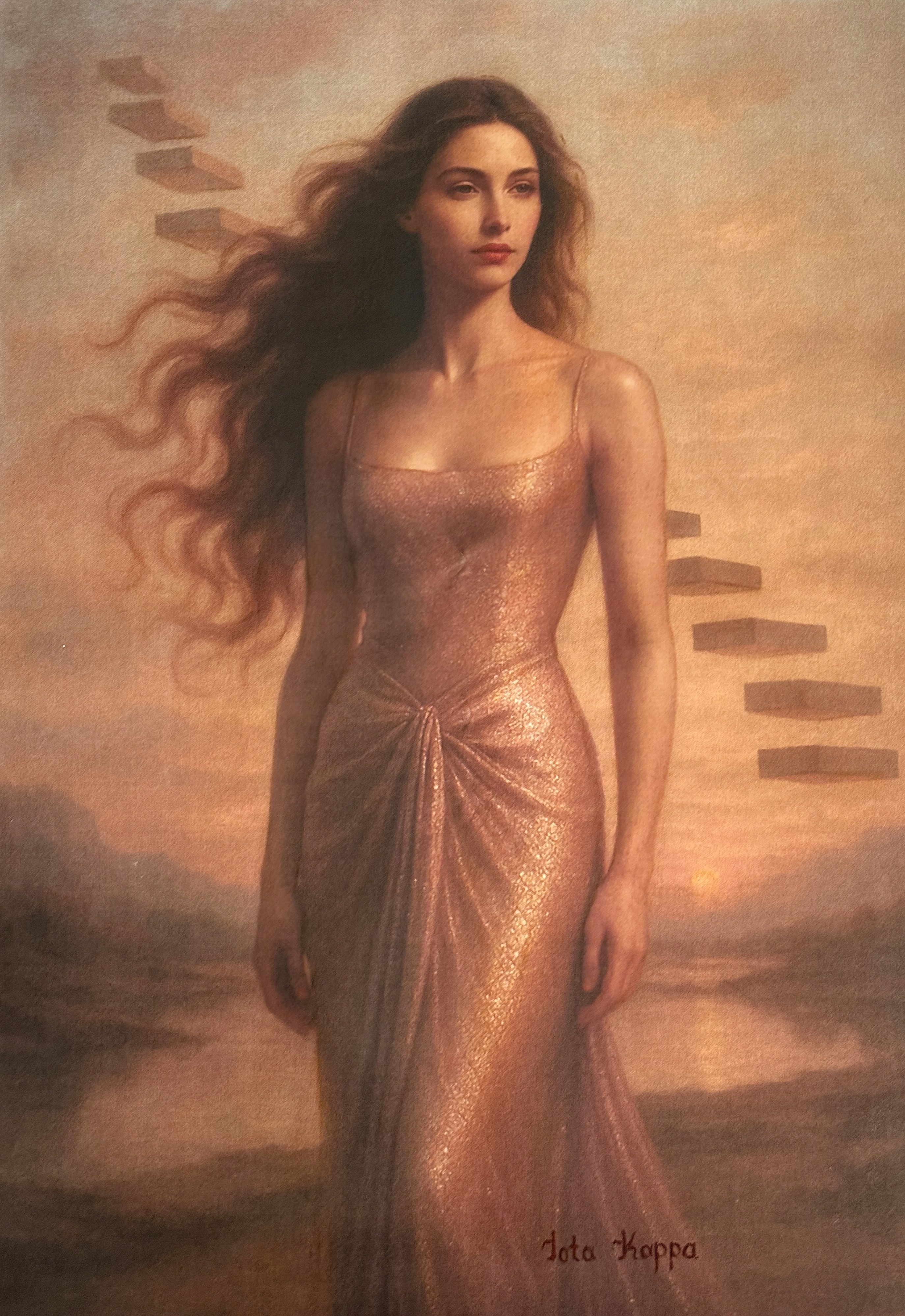"Transgressio" is a portrait of awakened courage. She stands not at the end of a path, but at its genesis, commanding new ground into being. The floating staircase behind her is not a relic of escape, but a testament to the invisible scaffolding shaped by vision. Inspired by Letter 20: Dear Pioneer, this work honors those who refuse inherited boundaries, who dismantle what no longer serves, and who shape reality through unwavering conviction.