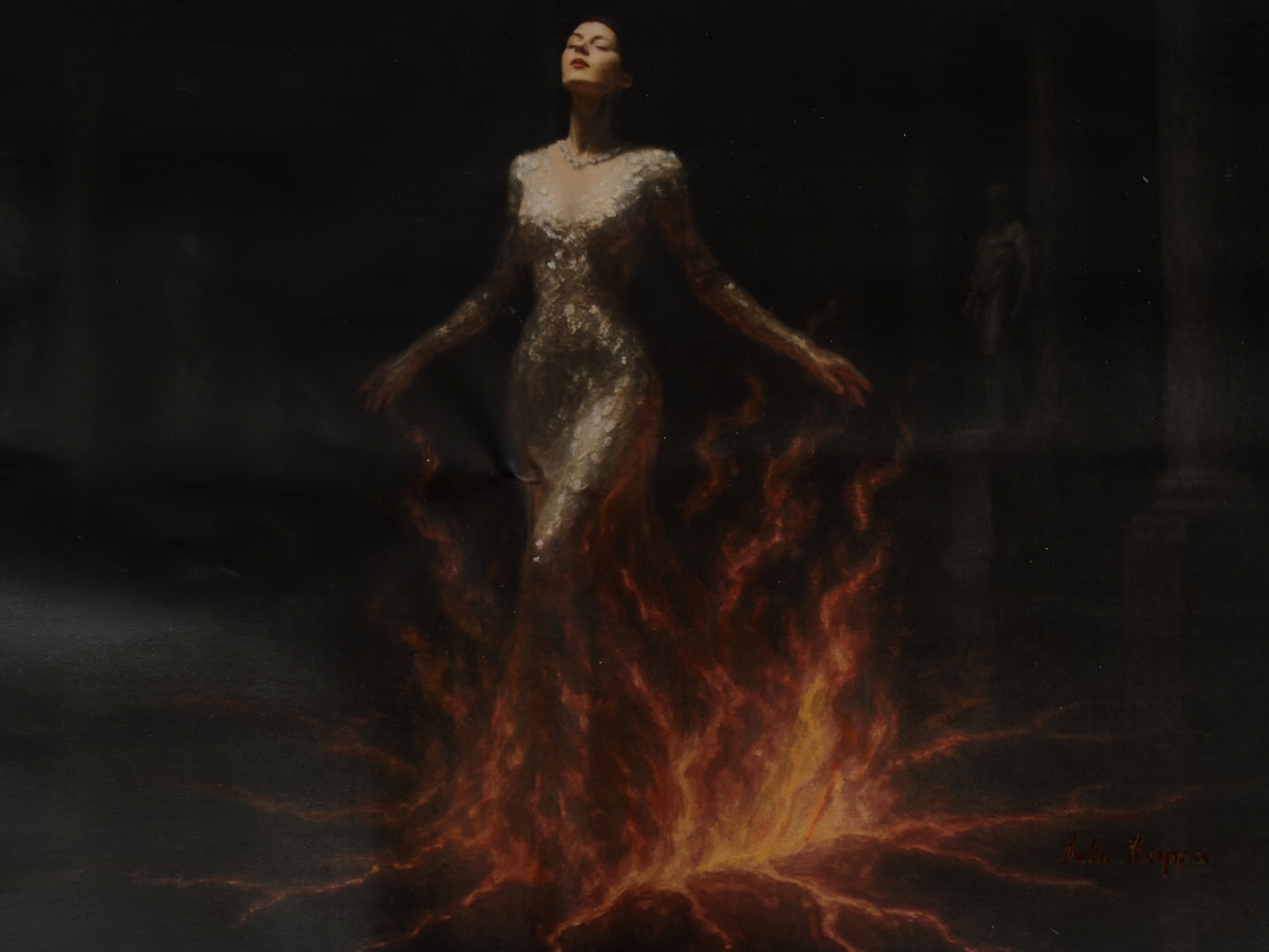 Set against a void, she stands with arms raised. This is rebirth as concentrated ascension, not return to innocence but a transmutation into radiance. Inspired by Letter 9: Dear Phoenix, this painting is a visual invocation of sublation where destruction becomes creation.