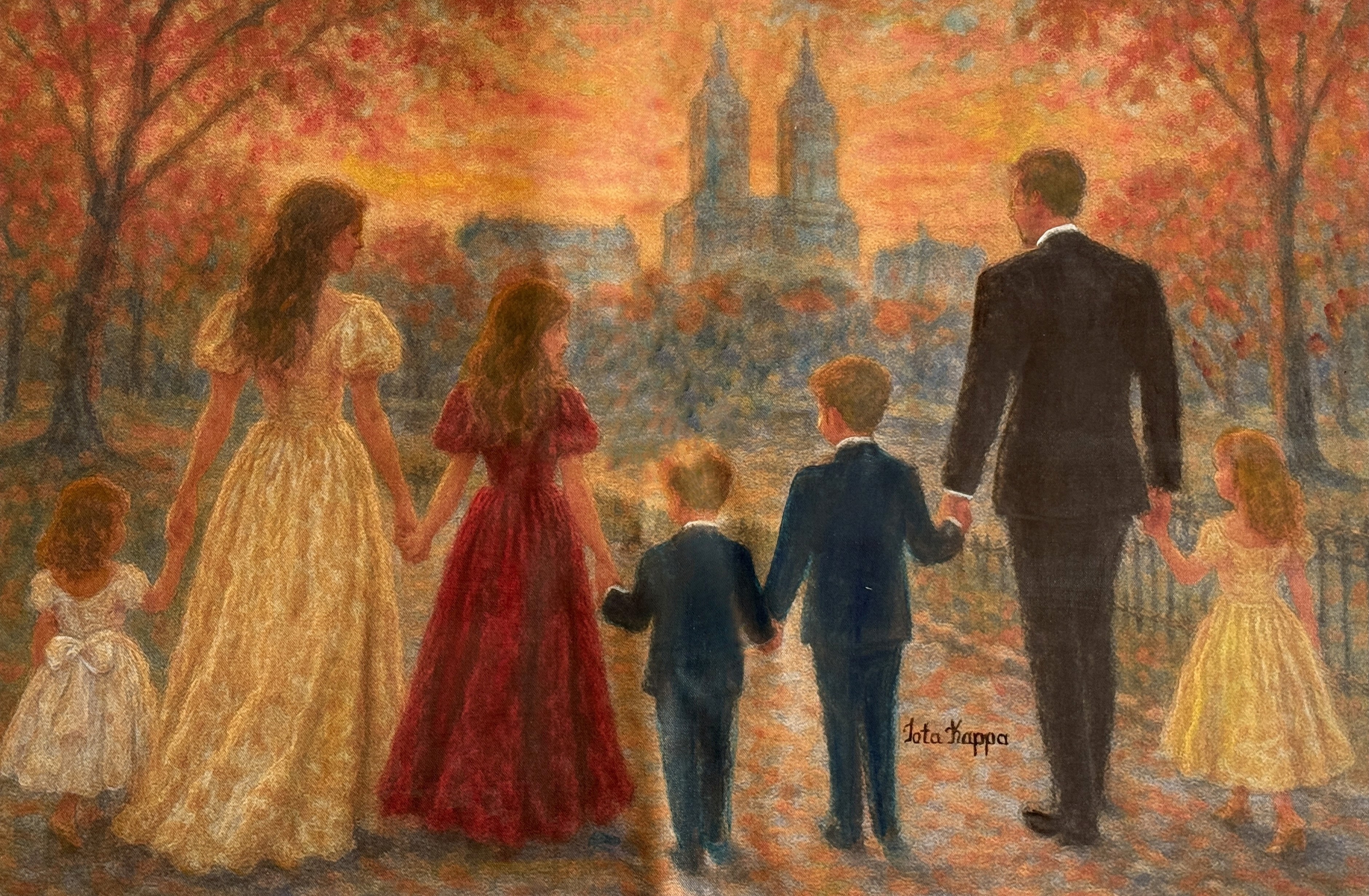 Beneath a sky ablaze with gold and memory, a family walks forward in unity. More than a moment captured, this is a tribute to life's gifts: a reverent tribute to the everyday blessings we often overlook. The rustle of leaves, the warmth of small hands, the shared horizon ahead—each element becomes a sacred gesture in the liturgy of life.