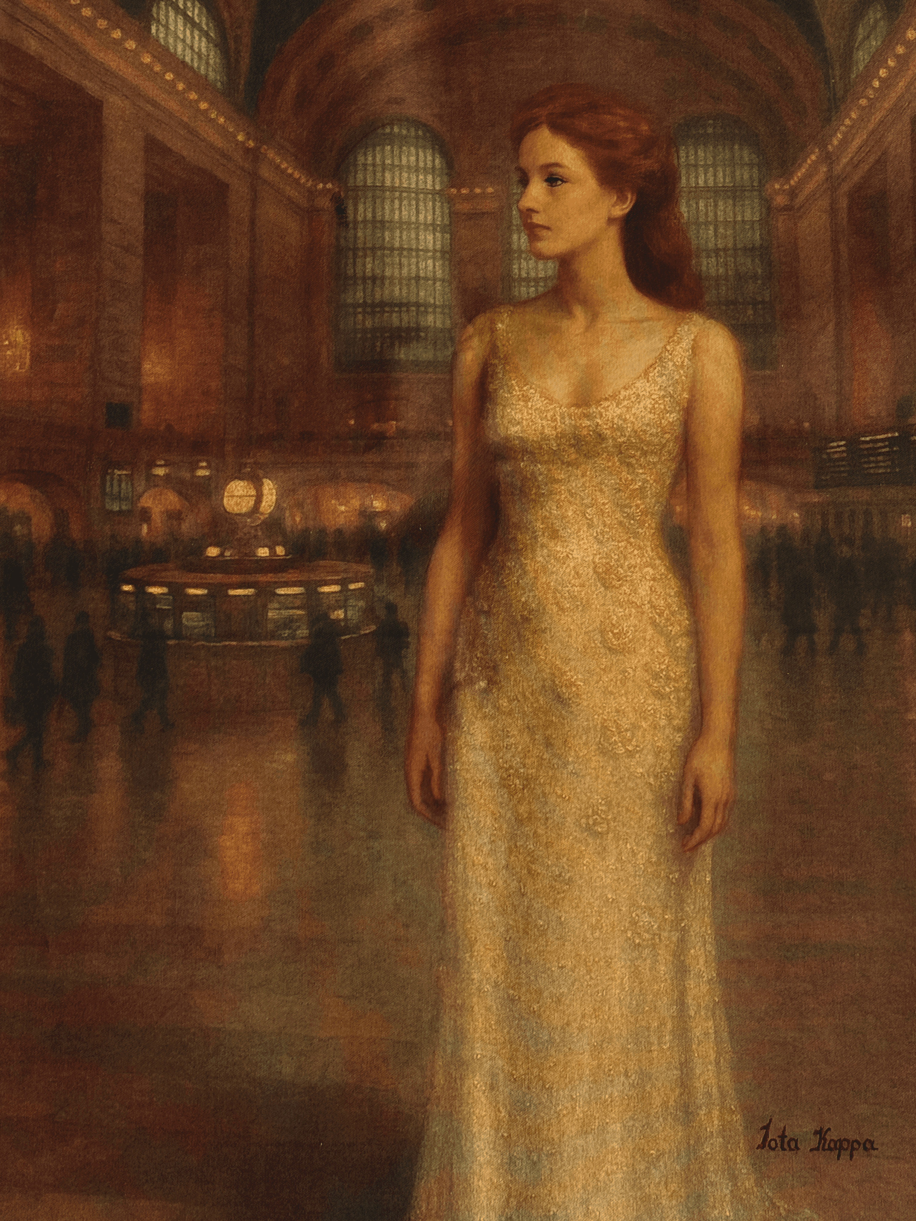 Set within the historic grandeur of Grand Central Terminal, this painting captures the essence of inner anchoring amid perpetual motion. The woman becomes a symbolic axis in a world of transit and urgency, embodying not an endpoint but a beginning, with trust as her point of origin.